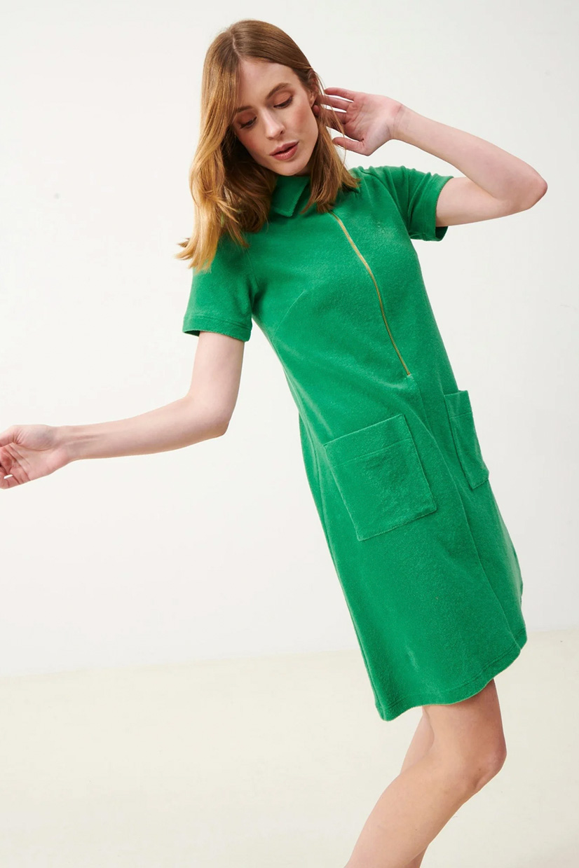 Lovisa är en storfavorit till årets varmare dagar. Frottéklänningen är ett perfekt val för en avslappnad sommardag eller en dag på stranden. Det mjuka och fluffiga materialet i 100% bomull ger en känsla av komfort och lyx. Lovisa har en klassig krage och kort ärm. Framtill har klänningen två praktiska fickor och dragkedja.