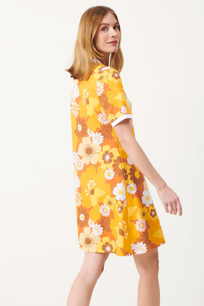 Meadow är en lekfull klänning med ett färgstarkt blommönster som ger ett tydligt retroinspirerat uttryck. Modellen har en rak och avslappnad siluett med rund halsringning och korta ärmar med kontrastkant som ramar in designen på ett fint sätt. Den enkla formen gör klänningen lätt att bära och enkel att styla – lika fin till sneakers för vardagen som till sandaler under varmare dagar.